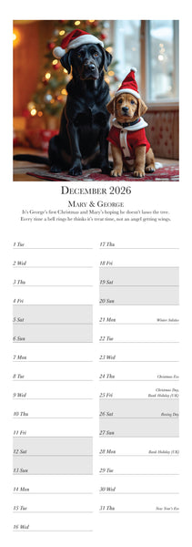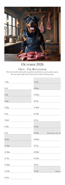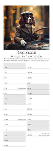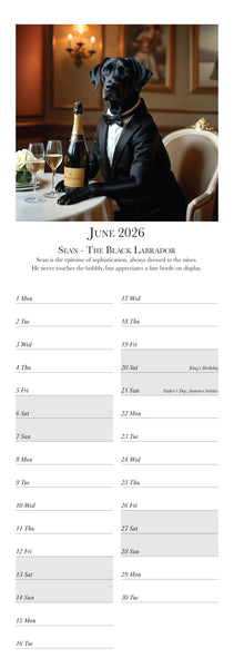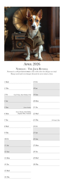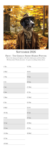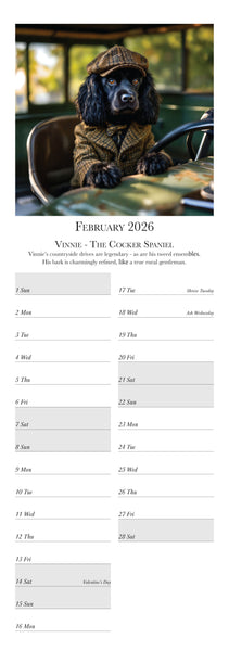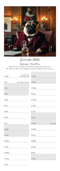Meet the most distinguished dogs of the year in the Dashing Dogs Calendar 2026 Created using advanced AI by Charles Sainsbury-Plaice this slim wall calendar features twelve regal canine characters including a Pug Golden Retriever Labrador Spaniel Dachshund and more Printed in the UK on luxury silk paper and produced under the Woodland Carbon Code A perfect calendar for dog lovers art fans and anyone who enjoys creative pet decor Published by Countryside Greetings