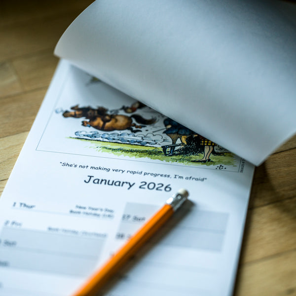 Celebrate the lighter side of riding with the Thelwell Pony Calendar 2026 A slim vertical wall planner featuring 12 classic pony cartoons by legendary British illustrator Norman Thelwell With a month per page layout printed on fine silk paper in the UK this eco-friendly calendar fits neatly into tack rooms kitchens or offices Ideal for horse lovers pony club families and countryside enthusiasts Produced under the Woodland Carbon Code by Countryside Greetings. Images this year include: Up for the Cup, Rodeo Rider, The Highjacker, Body Brush, Highly Recommended, Ghostly Stagecoach, Playtime's Over, The Correct Sitting Position, Tote Double, Merrylegs, Body Brush & Rapid Progress